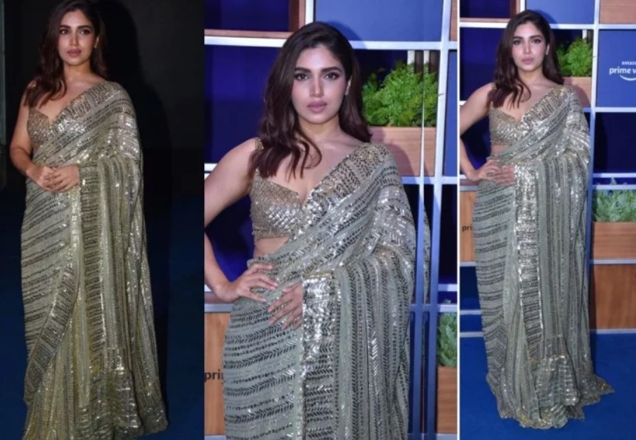 मनीष मल्होत्रा की डिजाइन की हुई शिमरी ग्रे रंग की साड़ी में भूमि इवेंट में पहुंची थी। जिसमें उनका लुक पहले से बेहद खूबसूरत नजर आ रहा था। डीप वी नेकलाइन वाले स्लीवलेस ब्लाउज को इस शिमरी सिकुइन साड़ी के साथ मैच किया गया था।