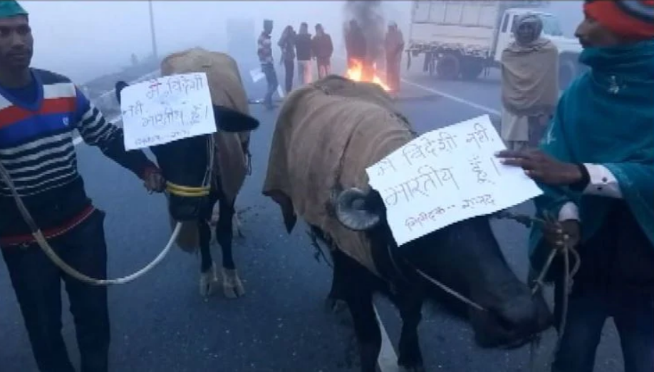 भैंसे के साथ नेशनल हाइवे पर प्रदर्शन