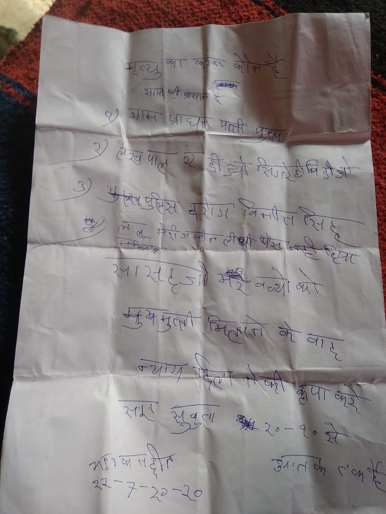 वहीं मृतक भगवानदीन ने अपने सुसाईड नोट में भी इस मामले का जिक्र किया है। मृतक ने प्रधानपति पर उसे धमकाने का भी आरोप लगाया है। पुजारी की मौत की सूचना से नाराज मोहनलालगंज सांसद कौशल किशोर ने बातचीत मे कहा कि पुजारी ने इस मामले की शिकायत उनसे की थी जिस पर उन्होने काकोरी पुलिस, एडीओ, बीडीओ के साथ ही एसडीएम से भी बात की थी और हस्ताक्षेप कर मामले का निराकरण कराने को कहा था पर अधिकारियों ने इसकी अनदेखी की जिसके कारण ही यह घटना हुई है। सांसद ने कहा कि वे इस मामले में पुलिस के वरिष्ठ अधिकारियों से वार्ता कर दोषियों पर कड़ी कार्यवाई करने को कहेंगे। काकोरी पुलिस ने पुजारी के शव को पोस्टमार्टम के लिए भेज दिया है पीएम रिपोर्ट आने के बाद ही आगे की कार्यवाई करने की बात कह रही है।