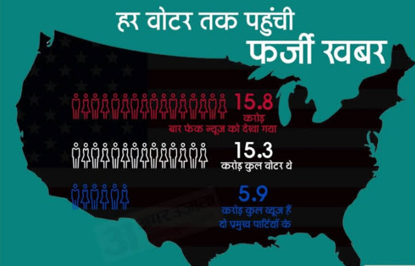 ‘आवाज’ नाम की एक संस्था ने फेसबुक की शीर्ष-100 फर्जी खबरों की समीक्षा की। उनकी रिपोर्ट में चौंकाने वाले आंकड़े सामने आए हैं। इन सौ खबरों को अमेरिका में 15.8 करोड़ बार देखा गया। जबकि पिछले साल मध्यावधि चुनावों में अमेरिका में कुल वोटर की संख्या 15.3 करोड़ थी। इसका मतलब हुआ कि प्रत्येक अमेरिकी वोटर कम से कम एक बार इन फर्जी खबरों से रूबरू हुआ।