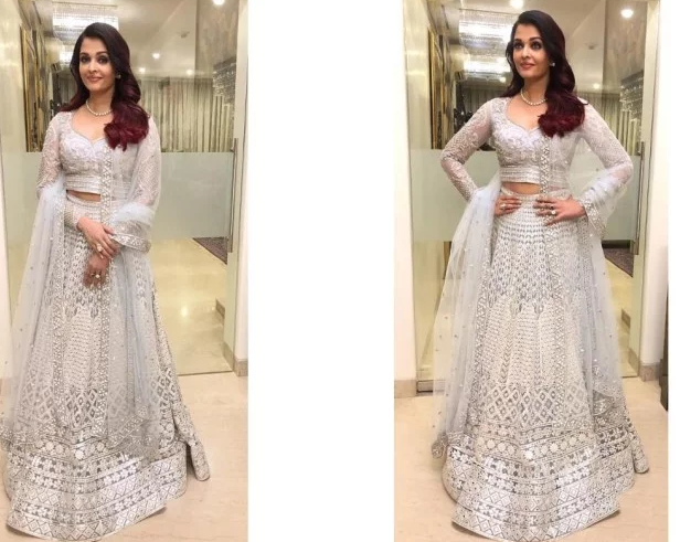 फुल नेट स्लीव के साथ टीमअप किया गया ऐश्वर्या राय के इस आइवरी कलर के लहंगे को मनीष मल्होत्रा ने डिजाइन किया है।लेकिन इस लहंगे के कलर और एंब्रायडरी को देखा जाय तो वो करीना कपूर के लहंगे जैसा ही दिख रहा है।