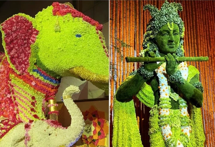 इस खास जश्न के लिए अंबानी परिवार ने पार्टी में सजावट फूलों से करवाई थी। फूलों से हाथी के अलावा भगवान श्रीकृष्ण की मूर्ति बनाई गई थी। देखिए तस्वीर…