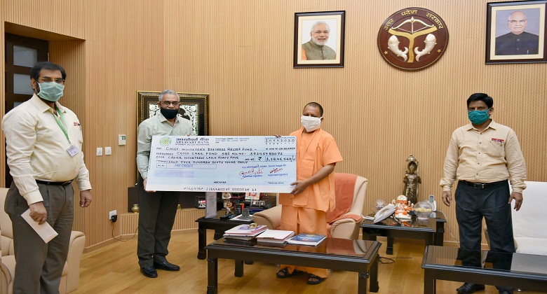 (www.arya-tv.com)उत्तर प्रदेश के मुख्यमंत्री योगी आदित्यनाथ को 30 अप्रैल, 2020 को उनके सरकारी आवास पर आर्यावर्त बैंक के चेयरमैन एस0बी0 सिंह, जनरल मैनेजर राजेन्द्र प्रसाद एवं मुख्य प्रबन्धक राजीव सिंह ‘चीफ मिनिस्टर डिस्ट्रेस रिलीफ फण्ड’/‘उत्तर प्रदेश कोविड केयर फण्ड’ में 1,19,45,569 रुपये का चेक भेंट करते हुए।