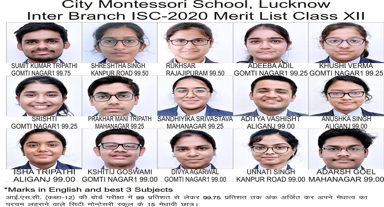 इसके अलावा, आई.एस.सी. (कक्षा-10) की बोर्ड परीक्षा में सी.एम.एस. से कुल 3478 छात्र परीक्षा में बैठ, जिसमें से 1923 छात्रों अर्थात 55.29 प्रतिशत छात्रों ने 90 प्रतिशत से अधिक अंक अर्जित किये हैं तथापि 723 छात्रों ने 95 प्रतिशत से अधिक अंक अर्जित किये हैं। इसके अलावा, आई.सी.एस.ई. की इण्टर-कैम्पस मेरिट लिस्ट में 157 छात्रों ने टाॅप-10 में जगह बनाई है।कुल मिलाकर, सी.एम.एस. से कुल 6283 छात्र आई.एस.सी. एवं आई.सी.एस.ई. परीक्षाओं में बैठे, जिसमें से 3389 छात्रों ने 90 प्रतिशत से लेकर 99.75 प्रतिशत तक अंक अर्जित किये हैं। शेष छात्रों ने भी अत्यन्त उच्च अंक अर्जित कर सी.एम.एस. का नाम गौरव बढ़ाया है। इस प्रकार आई.एस.सी. एवं आई.सी.एस.ई. परीक्षा परिणामों ने एक बार फिर दिखा दिया कि गुणात्मक शिक्षा के क्षेत्र में सिटी मोन्टेसरी स्कूल सर्वश्रेष्ठ है। इन परीक्षा परिणामों में सिटी मोन्टेसरी स्कूल के मेधावी छात्रों ने अभूतपूर्व प्रदर्शन कर लखनऊ का नाम पूरे देश में गौरवान्वित किया है।