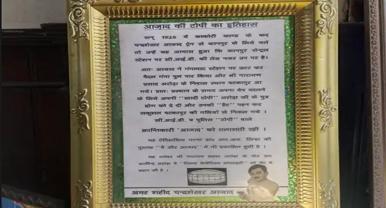 चंद्रशेखर आजाद की आखिरी टोपी मेस्टन रोड स्थित अशोक पॉलिटिकल लाइब्रेरी में सहेज कर रखी गई है। दरअसल चंद्रशेखर आजाद के मित्र अरोड़ा जी ने यह टोपी लाइब्रेरी की तिलक सोसाइटी को 2017 में धरोहर के रूप में रखने के लिए दी। लाइब्रेरी का इतिहास भी काफी पुराना है। यह लाइब्रेरी 1924 में बनाई गई थी। इसकी आधारशिला पंडित जवाहरलाल नेहरू ने रखी थी और इसका उद्घाटन राष्ट्रपिता महात्मा गांधी ने किया था। इसी लाइब्रेरी में चंद्रशेखर आजाद की आखिरी निशानी 100 साल पुरानी टोपी रखी हुई है।कानपुर के मेस्टन रोड स्थित अशोक पॉलिटिकल लाइब्रेरी के देखरेख करने वाले और तिलक सोसायटी के महामंत्री प्रदीप द्विवेदी ने बताया कि चंद्रशेखर आजाद की यह टोपी उनकी आखिरी निशानी है। क्योंकि यही टोपी पहने हुए उन्होंने काकोरी कांड किया था। इसके बाद वह जब अंग्रेजों से छिपछिपा कर भाग रहे थे। तभी ट्रेन से वह गंगा घाट स्टेशन पर उतर गए। इसके बाद अपने मित्र अरोड़ा जी जो पटकापुर में रहते थे, उनके घर पहुंच गए। उन्होंने बताया 1925 में नारायण प्रसाद अरोड़ा शहर कांग्रेस कमेटी के अध्यक्ष थे।