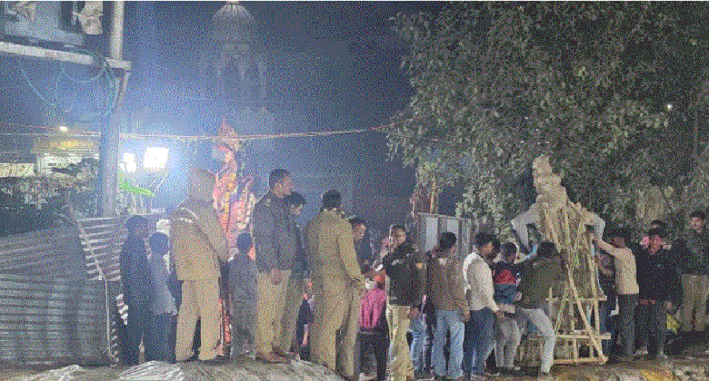 वाराणसी। वाराणसी के भेलूपुर थाना क्षेत्र में सोमवार रात मां सरस्वती की मूर्ति विसर्जन के दौरान अस्थायी कुंड की गहराई कम होने के आरोप को लेकर विवाद उत्पन्न हो गया। आयोजकों ने पुलिस और प्रशासन के खिलाफ नारेबाजी शुरू कर दी। आयोजकों का आरोप था कि मूर्ति का आकार काफी बड़ा है, जबकि कुंड की गहराई अपर्याप्त है, जिससे मूर्ति ठीक ढंग से डूब नहीं पाएगी और विसर्जन में असुविधा होगी। विवाद बढ़ता देख मौके पर पहुंचे पुलिस अधिकारियों ने समझा-बुझाकर स्थिति को शांत किया। काफी मशक्कत के बाद आयोजकों ने मूर्ति का विसर्जन किया।