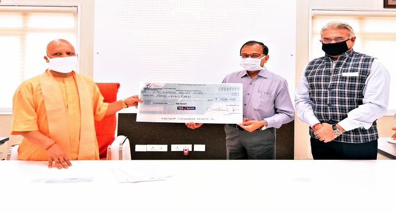 (www.arya-tv.com)उत्तर प्रदेश के मुख्यमंत्री योगी आदित्यनाथ को  अपर मुख्य सचिव नियुक्ति एवं कार्मिक तथा लखनऊ गोल्फ क्लब के अध्यक्ष  मुकुल सिंघल ‘मुख्यमंत्री कोविड केयर फण्ड’ हेतु क्लब की ओर से 50 लाख रुपए का चेक भेंट करते हुए।