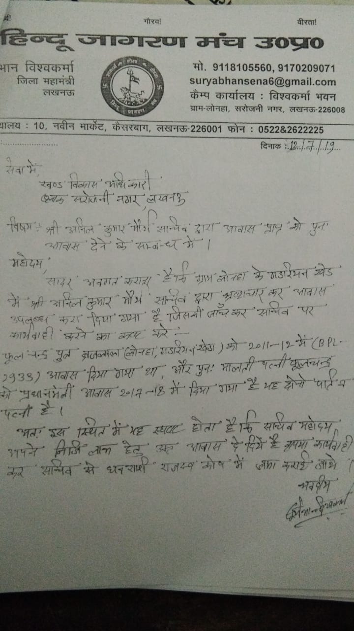 इसको लेकर करोड़ो रुपए का बजट बना और योजना तैयार हुई, लेकिन यहां भी भ्रष्टाचार के घुन ने गरीबों के हिस्से पर डाका डाल दिया। प्रधानमंत्री आवास और शौचालय में लूट और बंदरबांट की खबरें अब आम हो गई हैं। ताजा मामला सरोजनीनगर विधानसभा का है। यहां ग्राम पंचायत सचिव की उच्च अधिकारियों के संरक्षण में चल रही लूट का आडियो वायरल हुआ है। सचिव महोदया प्रधानमंत्री आवास के नाम पर गरीबों से धन उगाही करने का काम कर रही हैं। सरोजनी नगर विकास खंड के ग्राम सभा अन्धपुर देव का है जहां सुकरू पुत्र बैजू के प्रधानमंत्री आवास की फोटो खींचने के लिए सचिव द्वारा एक व्यक्ति को भेजा गया। सचिव शामीन बानो द्वारा लाभार्थी से उस व्यक्ति के लिए पेट्रोल के लिए 200 रुपए की मांग की जा रही है। हालांकि इस आडियों में कितनी सच्चाई है यह जांच का विषय है। लेकिन कई ग्रामीणों की मानों तो टेप शामीन बानो का ही है।