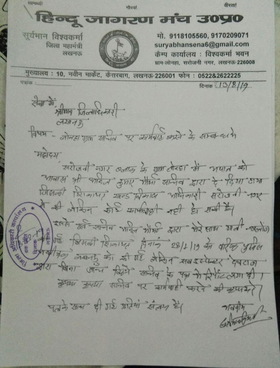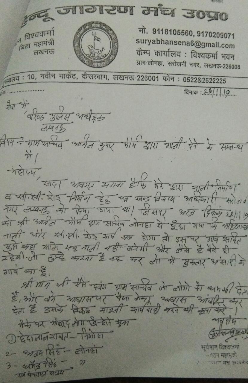 वहीं ग्राम सभा लोनहा में तैनात ग्राम सचिव अनिल मौर्य खुद को मुख्तार अंसारी का करीबी बताकर जमकर लूट कर रहा है। इसको लेकर हिंदू जागरण मंच के जिला महामंत्री सूर्यभान विश्वकर्मा ने खंड विकास अधिकारी से लेकर एस एस पी लखनऊ तक से शिकायत की मगर कार्यवाही आज तक नहीं हुई।