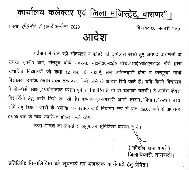 वाराणसी।(www.arya-tv.com) पूर्वांचल में पड़ रही भीषण ठंड को देखते हुए जिलाधिकारी वाराणसी की ओर से आठ जनवरी तक ठंड की वजह से अवकाश को बढ़ा दिया गया है। सभी यूपी बोर्ड, संस्कृत, मदरसा बोर्ड, सीबीएसई, आइसीएसई से संचालित सभी विद्यालय आगामी आठ जनवरी तक ठंड की वजह से बंद रहेंगे। यदि कहीं पर प्री बोर्ड और प्रयोगात्मक परीक्षाएं चल रही हैं तो वह यथावत जारी रहेंगी। वहीं अध्यापक, कर्मचारी, विभाग, प्रबंधन को सौंपे गए शिक्षण कार्य यथावत जारी रहेंगे। सभी विभागीय कार्य सुबह नौ बजे से शाम तीन बजे तक किए जाएंगे। इस आशय से संबंधित पत्र रविवार दोपहर बाद जिलाधिकारी कार्यालय से जारी किया गया।