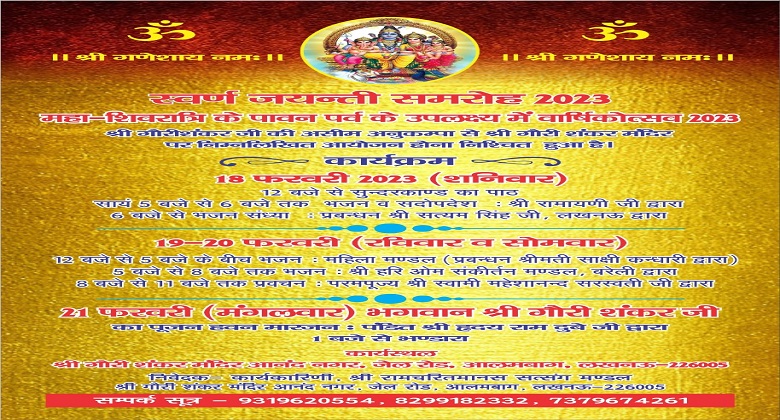 (www.arya-tv.com) पुरानी जेल रोड स्थित आनंदनगर के प्राचीन गौरीशंकर मंदिर की स्थापना के पचासवर्ष पूरे होने के अवसर पर इस शिवरात्रि विशेष कार्यक्रमों का आयोजन किया गया है .मंदिर प्रबंधन समिति के अनुसार कार्यकारिणी श्री राम चरित मानस सत्संग मंडल हर साल शिवरात्रि को विशेष कार्यक्रमों का आयोजन करता है .इस बार ये कार्यक्रम १८ फरवरी से आरम्भ हो कर २१ फ़रवरी तक चलेगे.