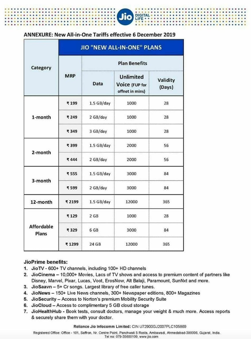 रिलायंस जियो का नया टैरिफ प्लान 6 दिसंबर से लागू हो गया है. कंपनी ने बुधवार (4 दिसंबर) को अपने नए प्लान All-in-one plan की घोषणा कर दी थी. नए टैरिफ प्लान 199 रुपये, 555 रुपये और 2,199 रुपये के प्लान शामिल हैं. 199 रुपये वाले प्लान में 28 दिन की वैलिडिटी मिलेगी. इस प्लान में जियो से जियो नेटवर्क पर कालिंग फ्री है. जबकि दूसरे नेटवर्क पर कॉलिंग के लिए 1,000 मिनट्स मिलेंगे. साथ ही इसमें रोज 1.5 GB डेटा मिलेगा.