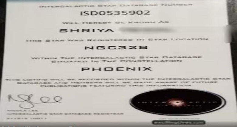 दरअसल गाजियाबाद में एक तस्वीर खूब वायरल हो रही है. यह तस्वीर एक तारा डेटाबेस रजिस्ट्रेशन सर्टिफिकेट है. जिस पर स्टार डेटाबेस नंबर लिखा हुआ है. जिस व्यक्ति के नाम यह रजिस्ट्री की गई है उसका नाम श्रेया मौजूद है. इस सर्टिफिकेट में अंतरिक्ष की लोकेशन के हिसाब से तारे की वर्तमान मौजूदगी भी बताई गई है. इतना ही नहीं बल्कि किसी तारे मंडल में यह सितारा मौजूद है यह भी बताया गया है. सर्टिफिकेट के अनुसार यह तारा NGC328 फिनिक्स तारामंडल में मौजूद है. किसी तारे को अपने प्रेमिका के नाम करने पर लोग इस अजब गजब आशिक की मिसाल दे रहे है.