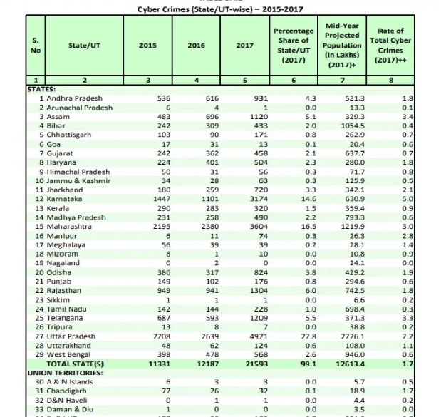 इन तीन सालों में सबसे कम साइबर क्राइम नागालैंड में हुआ है जिसकी संख्या सिर्फ 2 है, वहीं केंद्र शासित प्रदेश में अधिक साइबर क्राइम दिल्ली में (874) हुए हैं। जबकि केंद्र शासित प्रदेश में से लक्षद्वीप में साल 2015-17 के बीच कोई साइबर क्राइम हुआ ही नहीं है।