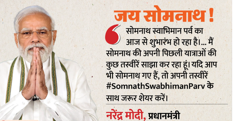 मोदी ने कहा कि वर्ष 2026 में 1951 के भव्य समारोह के 75 वर्ष पूर्ण होने का स्मरण भी किया जा रहा है। उन्होंने ‘जय सोमनाथ’ के उद्घोष के साथ बताया कि आज से सोमनाथ स्वाभिमान पर्व का शुभारंभ हो रहा है। इस अवसर पर उन्होंने सोमनाथ की अपनी पिछली यात्राओं की तस्वीरें साझा करते हुए लोगों से आग्रह किया कि यदि वे भी सोमनाथ गए हैं, तो अपनी तस्वीरें #SomnathSwabhimanParv के साथ साझा करें।