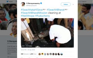 प्रधान मंत्री नरेन्द्र मोदी जी ने महात्मा गांधी की 150वीं जयंती पर ‘स्वच्छ ही सेवा’ का अभियान शुरू किया था, जो की 15 सितंबर से 2 अक्टूबर तक चला। स्वच्छ भारत अभियान को ध्यान में रखते हुए पुदुच्चेरी के सीएम वी. नारायणस्वामी नाली साफ करने के लिए उतरे।