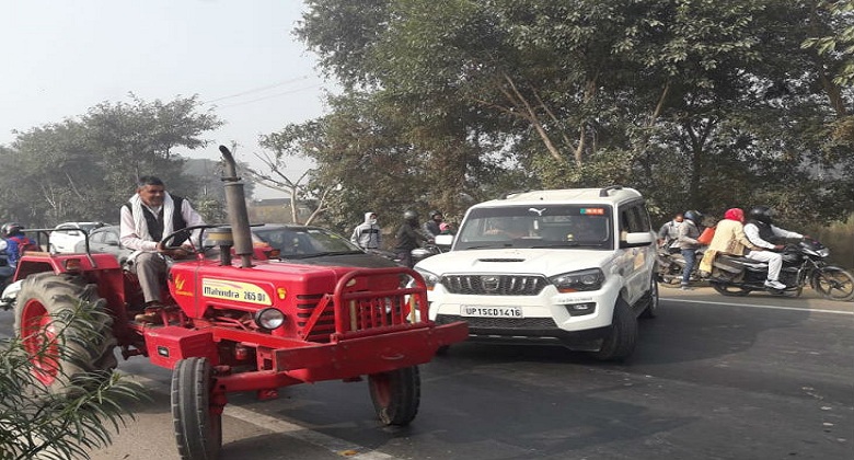 किसानों ने हाईवे के बीच ट्रैक्टर खड़ा किया
